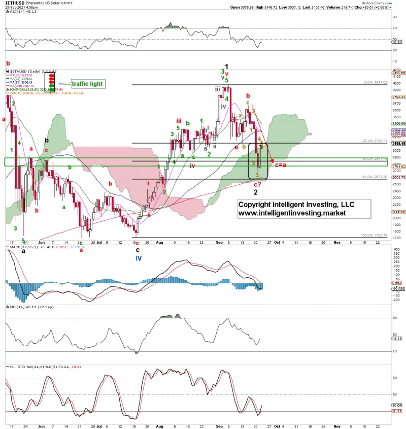 What transpired? Ether had a complex (red) intermediate wave-iv to $2952 (August 18 low), an extended -subdividing- wave-v to complete (black) major wave-1 at $4026on September 3, and ETH dropped to as low as $2678 on Tuesday, September 21. Albeit the cryptocurrency did not adhere to the ideal/textbook path, the overall pattern forecasted over a month ago, and in fact, already drafted early August (see here), came to fruition.